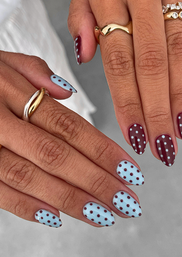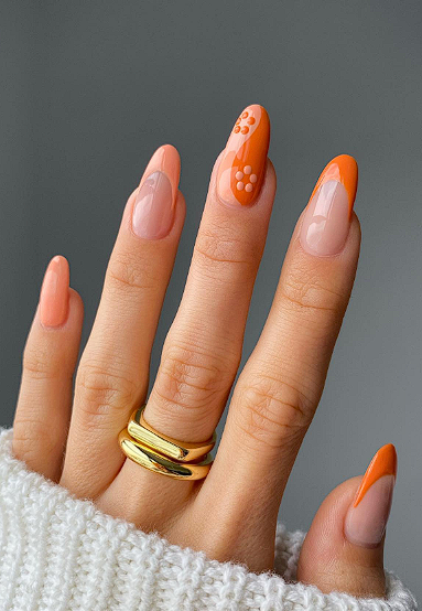 Tiny orange dots on a nude or white base create a playful, chic look. Minimal polka dots maintain elegance without appearing busy. Works on short or medium nails for subtle detailing. Perfect for summer or spring-inspired nails.