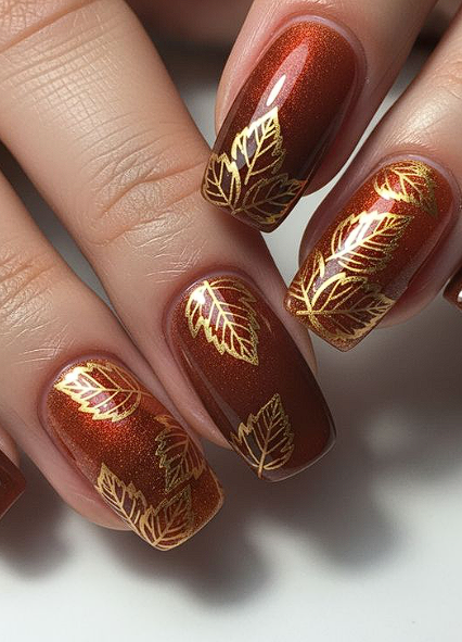 Burnt orange looks stunning with matte finishes, especially on almond or short square nails. Glossy burnt orange also looks rich and luxurious, particularly when paired with gold rings.
