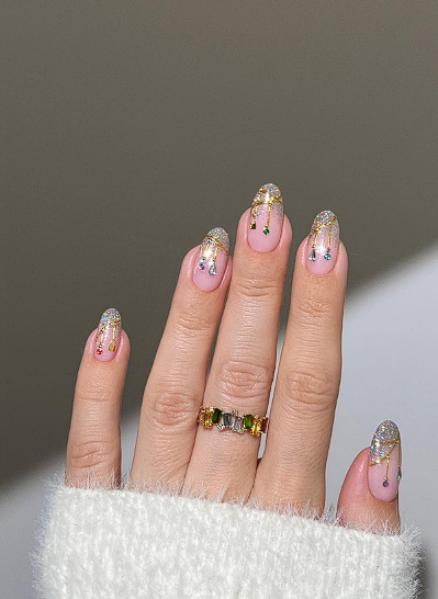 Paint a solid base in nude, pink or any colour you like. Then add glitter starting at the tips and gently fading halfway down. This gives sparkle where your nails show most while leaving the cuticle area clean and comfortable for regrowth.
