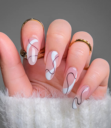 Keep the base sheer or light, then use a fine brush to draw one or two curved lines in a single colour. The rest of the nails can be solid in the same shade. This gives a touch of trend without crowding the shorter length.