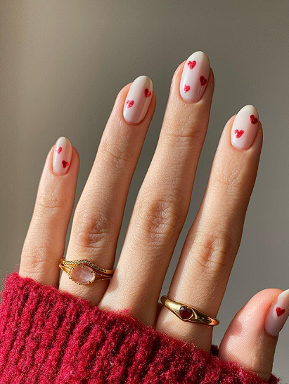 - Nude base with a tiny red heart near the cuticle of each nail