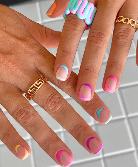 On short nails, coloured tips look playful and modern. Keeping the rest of the nail sheer or nude stops the design from feeling heavy.