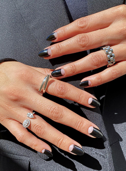 Paint the nail in one colour and leave the half moon bare, or reverse it by painting the half moon in a contrasting shade. On short nails, half moons add subtle interest and can echo the shape of rings and jewellery.