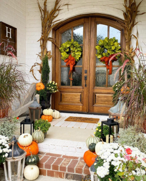 An arched wooden double door showcases dramatic fall decor with towering cornstalks flanking vibrant wreaths featuring orange bows. Multiple pumpkins scattered across the steps and mums in various containers create an abundant harvest display that maximizes every inch.
