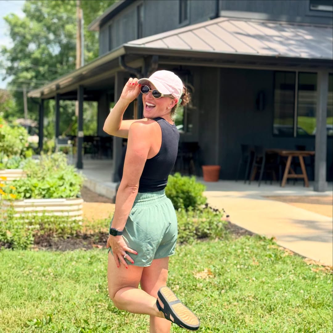 Embrace a practical yet stylish daily look with this active ensemble, pairing a sleek black tank top with comfortable mint green gym shorts, perfect for running errands or staying fit. This outfit is completed with a casual baseball cap, sunglasses, and black flats for an effortlessly put-together appearance.