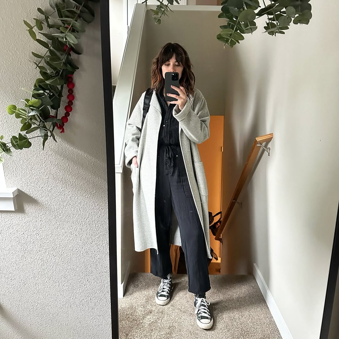 This is the perfect “stay at home mom outfit,” pairing a comfortable black jumpsuit and a long grey cardigan with classic sneakers for an effortlessly cool daily look. Master the art of practical yet stylish dressing with this easy, go-to ensemble for running errands or relaxing at home.
