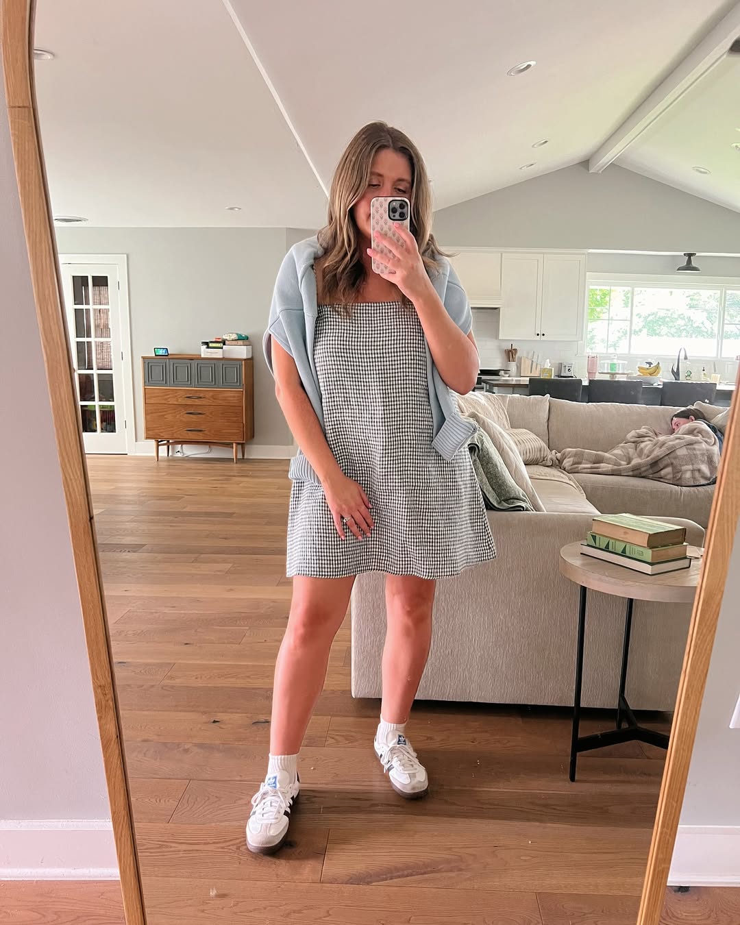 Embrace comfortable yet stylish everyday wear with a black-and-white gingham mini dress, perfectly layered with a light blue cardigan and styled with clean white sneakers. This effortless ensemble is ideal for running errands or enjoying a casual day out while still looking put-together.