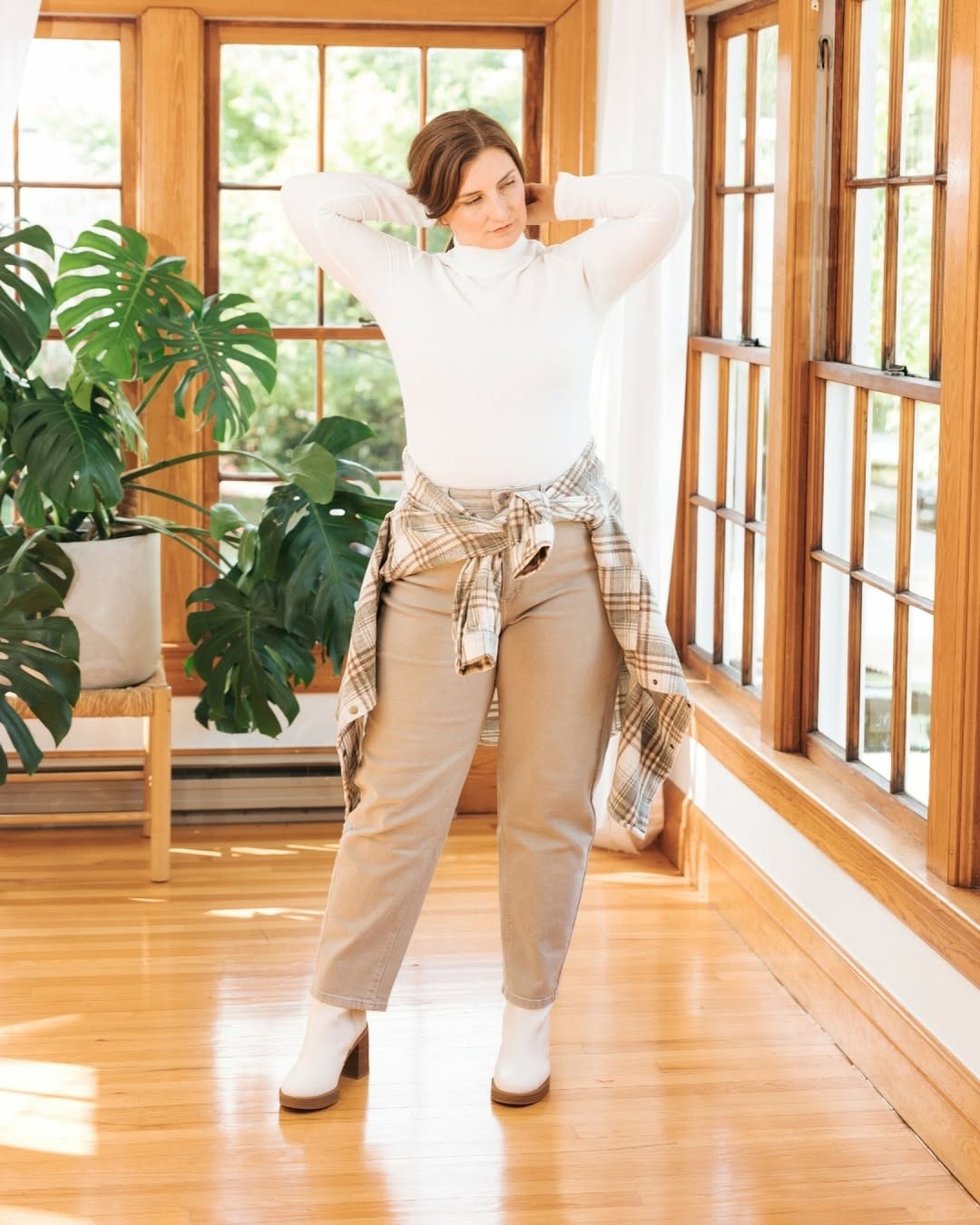 This cozy-chic outfit features a fitted white long-sleeve top paired with relaxed neutral pants and a plaid shirt tied at the waist for added texture. Finished with sleek ankle boots, it’s a comfortable yet stylish look perfect for casual days with a polished touch.