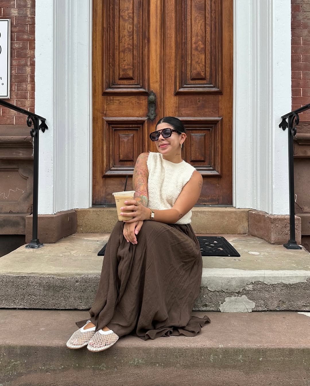 Embrace relaxed elegance with this effortlessly stylish look, pairing a cozy knit vest and a flowing linen skirt for the perfect blend of comfort and sophistication. This versatile outfit is ideal for running errands or enjoying a quiet moment with a coffee.