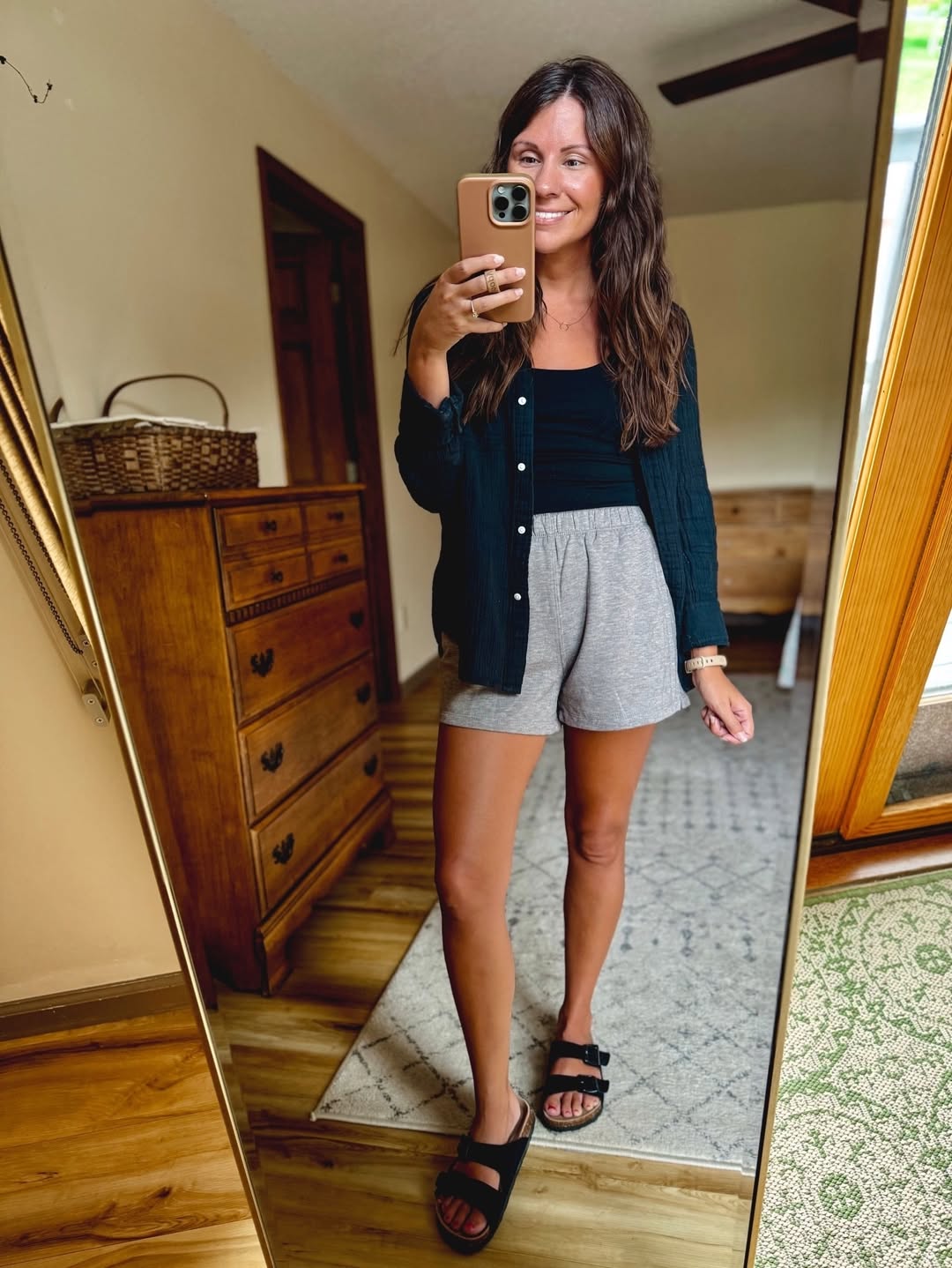 This is a comfortable yet put-together outfit ideal for staying in, which features a lightweight dark cardigan layered over a black top and soft gray knit shorts. The look is completed with black slides for easy, at-home style that doesn’t sacrifice comfort.