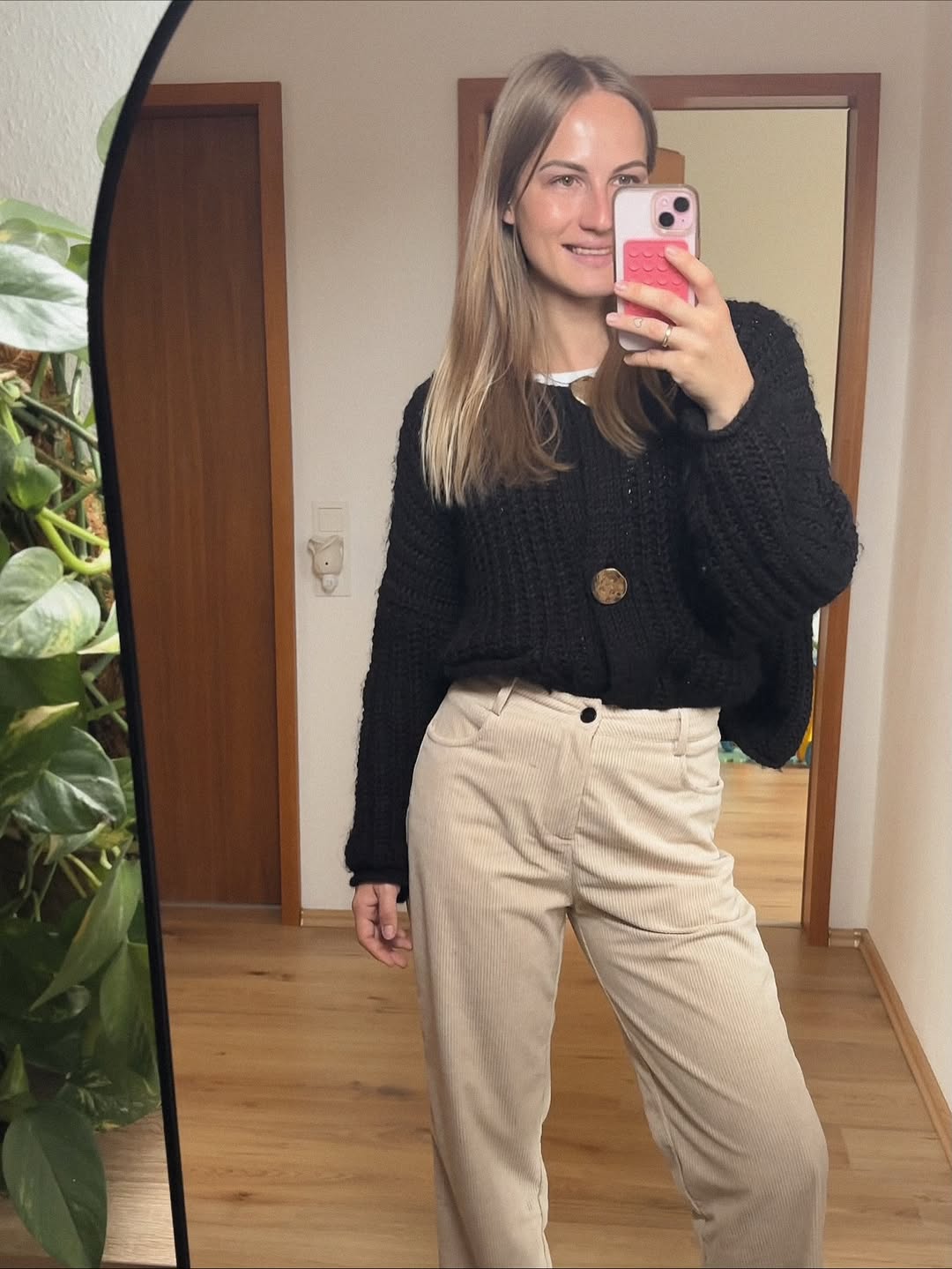 This outfit strikes the perfect balance between cozy comfort and casual style, pairing a chunky black cardigan with wide-leg beige corduroy pants. It’s an effortlessly chic look that’s ideal for a comfortable yet put-together day at home.
