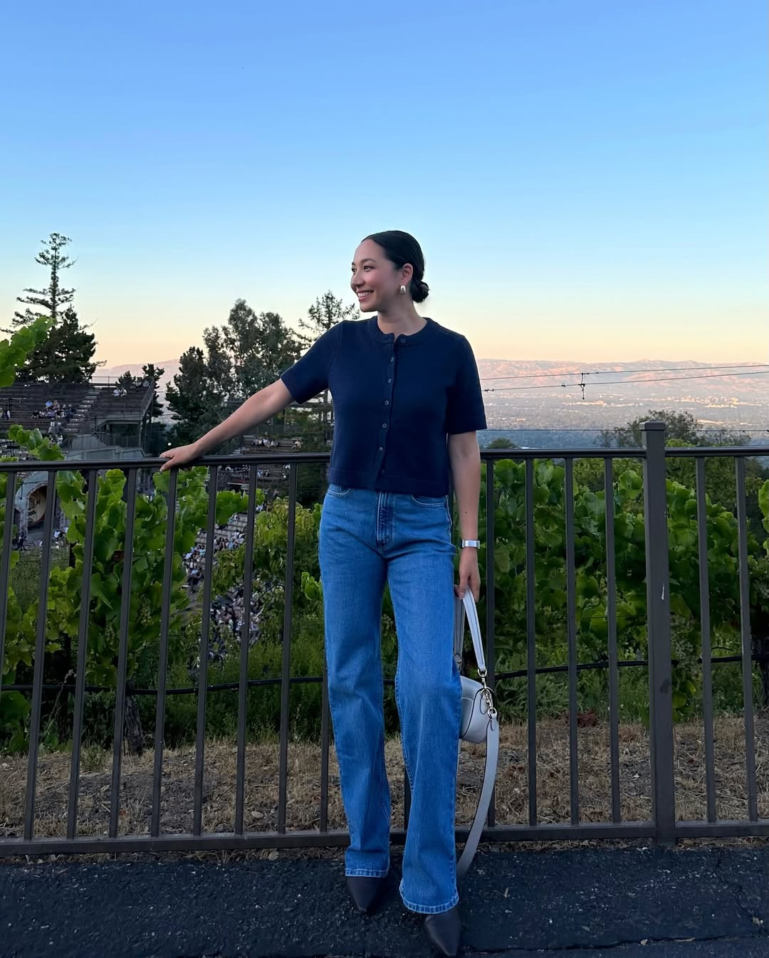 Embrace comfortable yet classic daily wear with this refined outfit, pairing a sleek navy knit top with a pair of flattering wide-leg denim jeans and simple black flats. This effortlessly chic ensemble is a versatile option for any casual day out or relaxing afternoon at home.