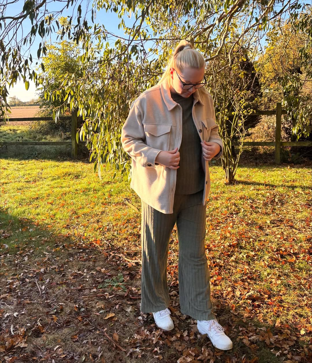 This look balances an oversized beige shirt-jacket with comfortable olive green ribbed pants, creating a perfect, relaxed combination for a stylish day in. Paired with white chunky shoes, the outfit is both cozy and put-together for effortless at-home chic.