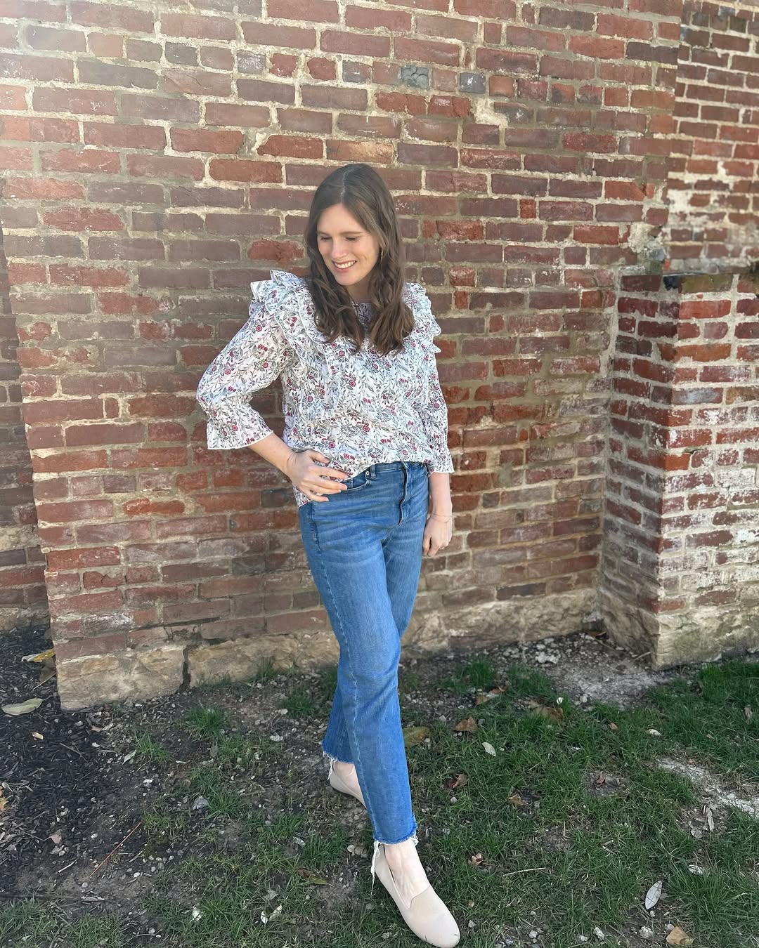 Embrace comfortable yet stylish daily wear by pairing a charming white floral ruffle blouse with classic blue straight-leg jeans and neutral pointed flats. This look is a perfect example of effortless elegance, easily transitioning from running errands to a casual day out.