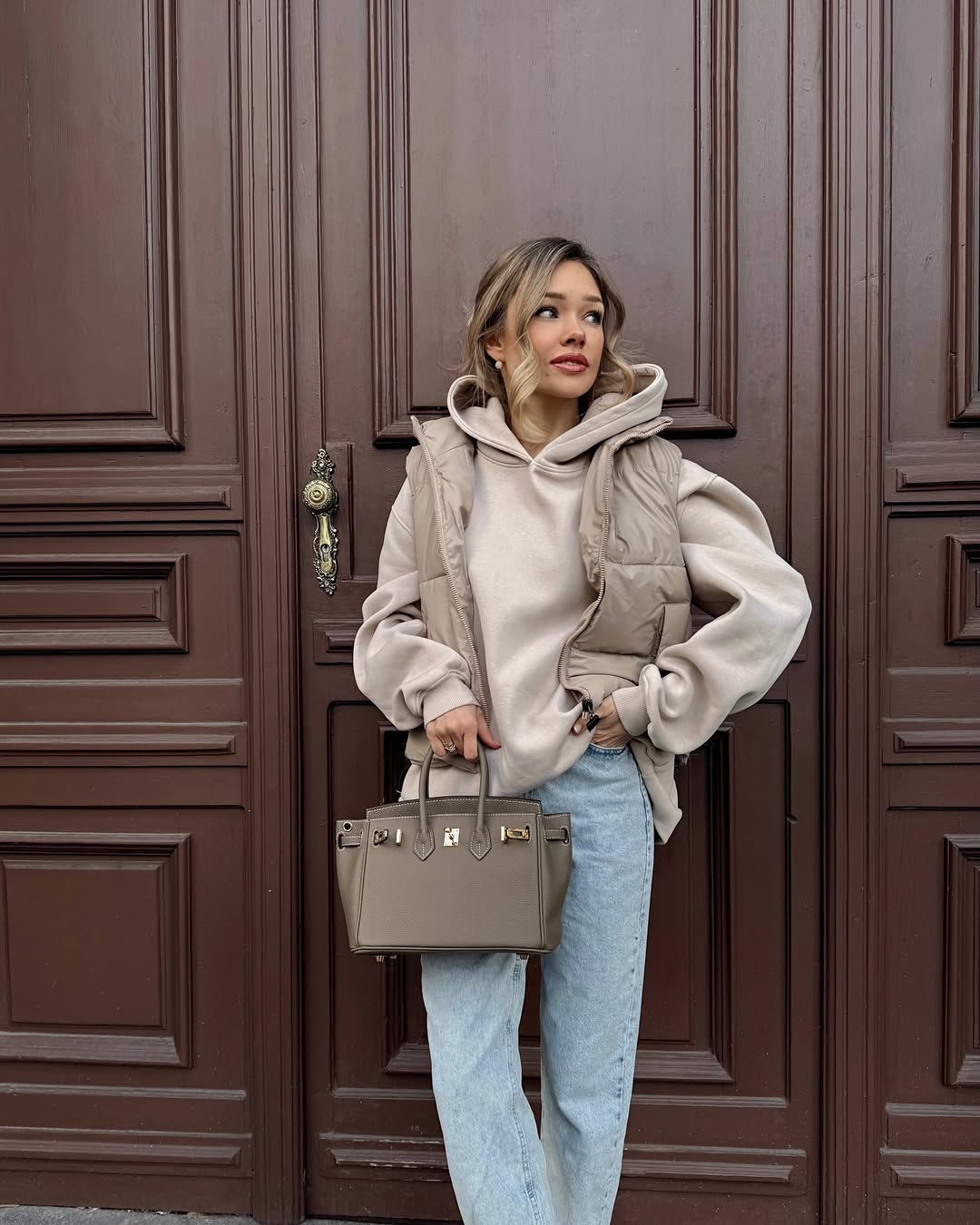 Embrace comfortable yet stylish daily wear with this effortlessly chic ensemble, pairing a cozy beige hoodie and matching puffer vest with classic light-wash jeans and white sneakers. This layered look is a perfect example of practical elegance, easily transitioning from running errands to a casual day out.