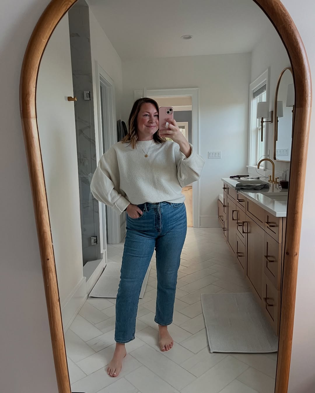 Achieve comfortable yet stylish daily wear by pairing an oversized cream sweater with classic blue straight-leg jeans for a simple and effortlessly chic look. This versatile ensemble is a go-to for running errands or enjoying a casual day at home, proving practicality and style can go hand in hand.