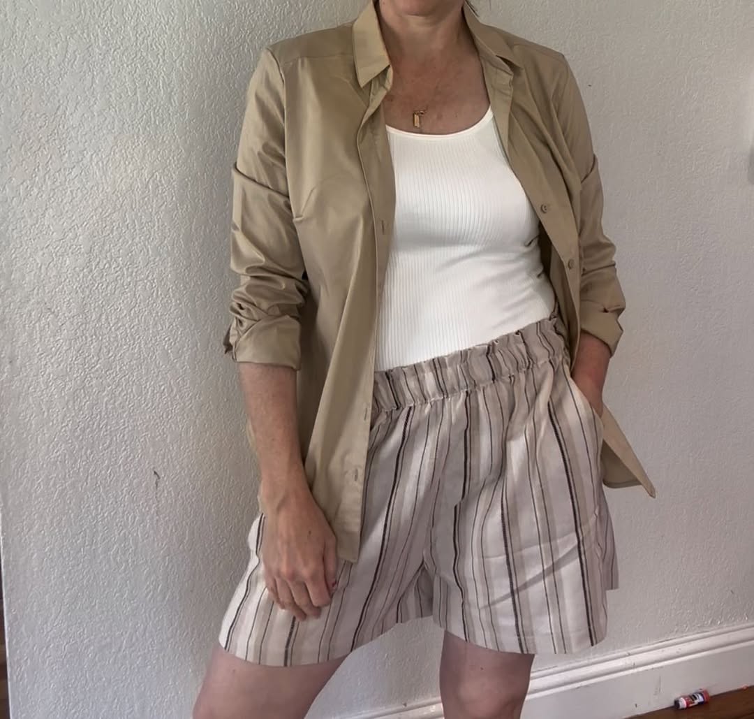 This outfit pairs a crisp white tank with striped, relaxed-fit shorts and a lightweight tan button-up worn open for an easy layered feel. The neutral palette and casual tailoring make it a chic choice for warm days when you want to look put-together without trying too hard.