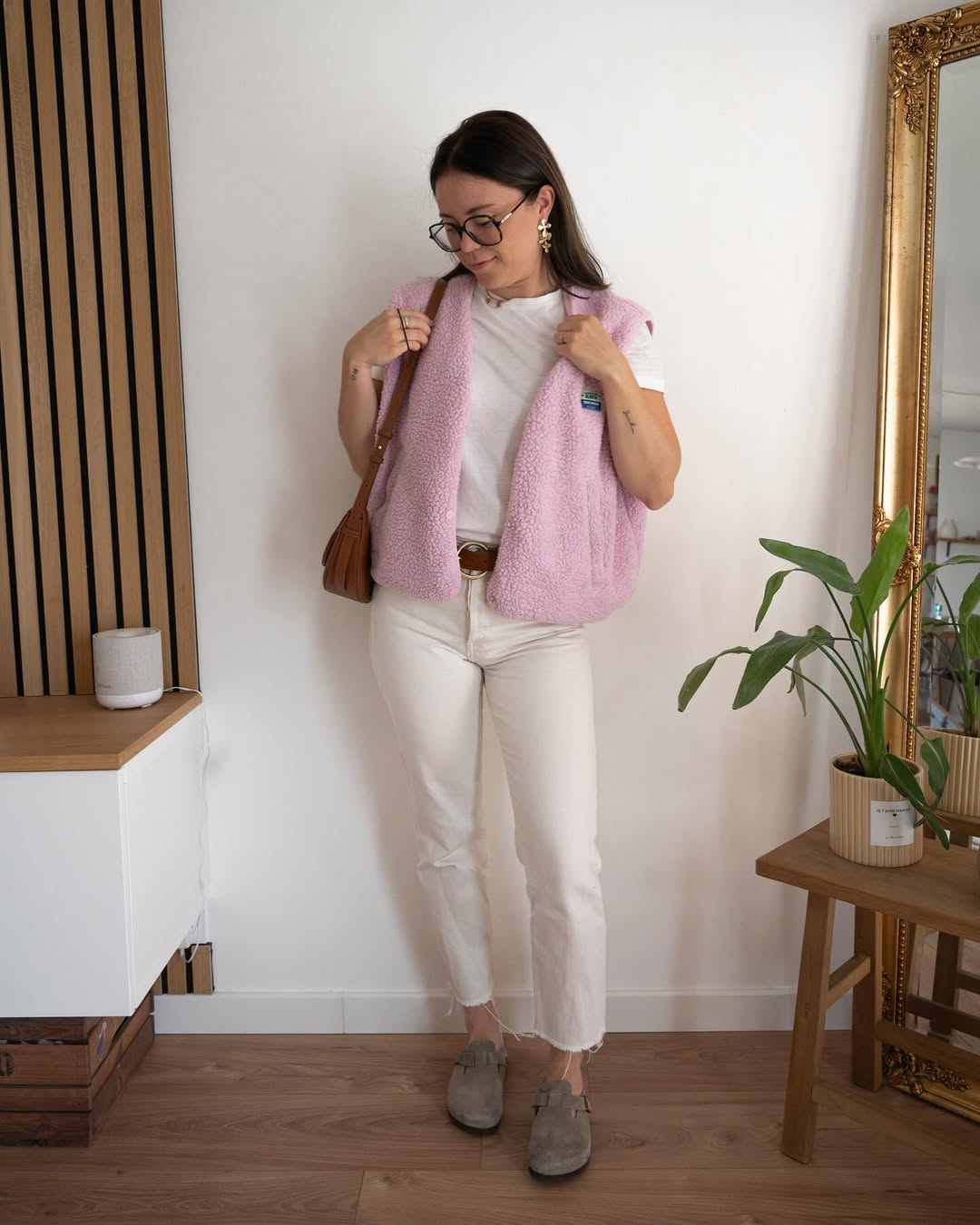 This outfit is a delightful blend of cozy and chic, pairing a vibrant lilac sherpa vest with crisp white straight-leg jeans for a fresh, layered look. Accessories like a tan belt, matching crossbody bag, and neutral suede clogs pull the entire ensemble together with a cohesive, earthy elegance.
