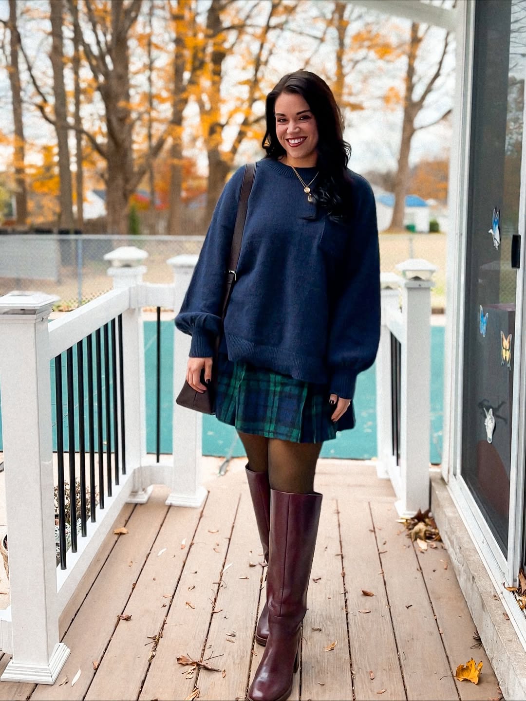 Master the “stay at home mom outfit” with this stylish yet practical fall ensemble, pairing a cozy oversized navy sweater and a classic plaid skirt. This look, completed with tall boots and a practical shoulder bag, perfectly balances comfort for daily activities with a put-together aesthetic.