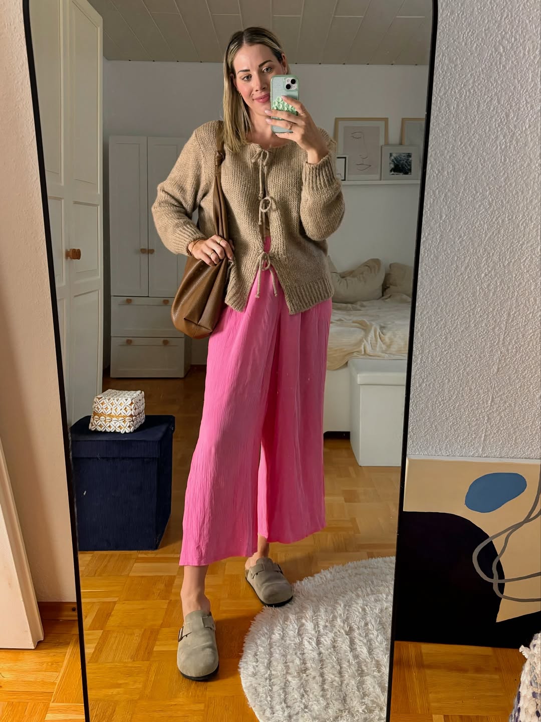 Embrace comfortable yet stylish daily wear with this effortlessly chic ensemble, pairing a cozy beige tie-front cardigan and vibrant pink wide-leg trousers for a pop of color. The look is completed with practical grey clogs and a simple shoulder bag, offering a perfect blend of ease and personality for any casual day.