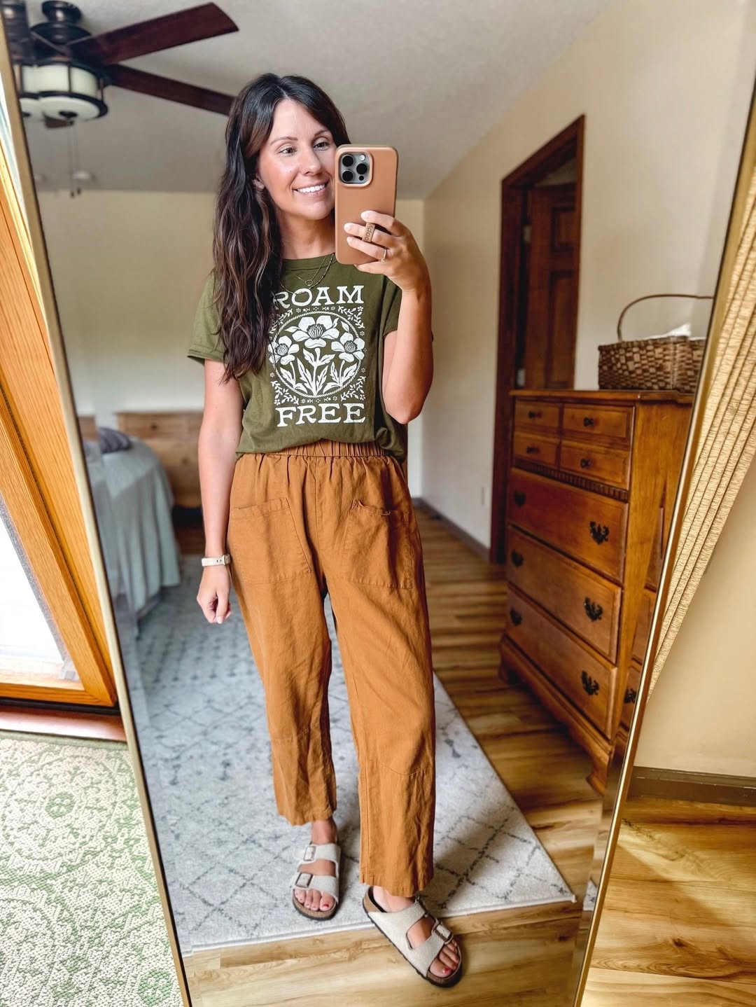 This look showcases a graphic print “Roam Free” olive tee paired with rust-colored linen blend pull-on pants for ultimate comfort and a relaxed, natural feel. The outfit is grounded with neutral Birkenstock-style sandals, making it an ideal, effortless choice for a laid-back day at home.