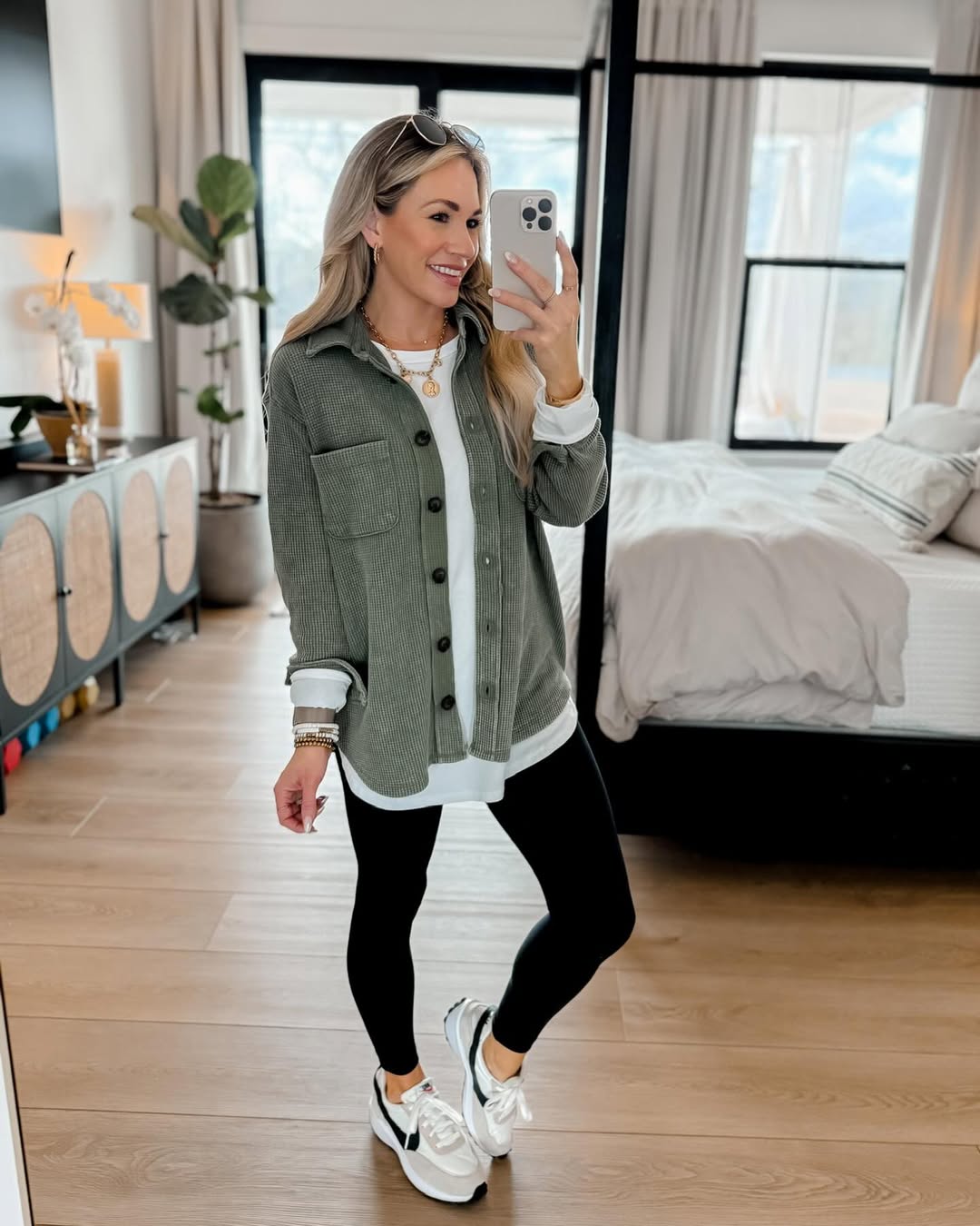 This is the ultimate look for casual comfort, featuring an olive green V-neck henley hoodie paired effortlessly with black leggings and classic white sneakers. The outfit is a perfect example of chic, everyday style that balances a relaxed fit with a clean, modern aesthetic.