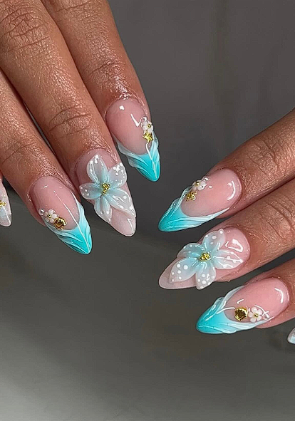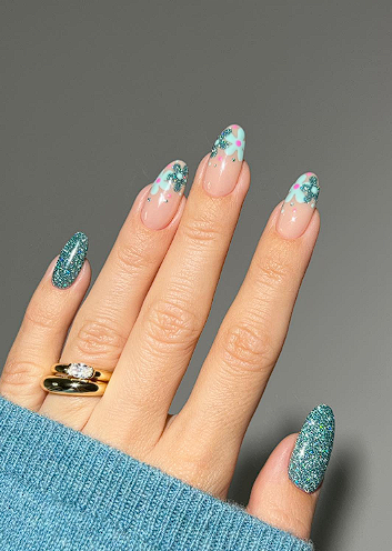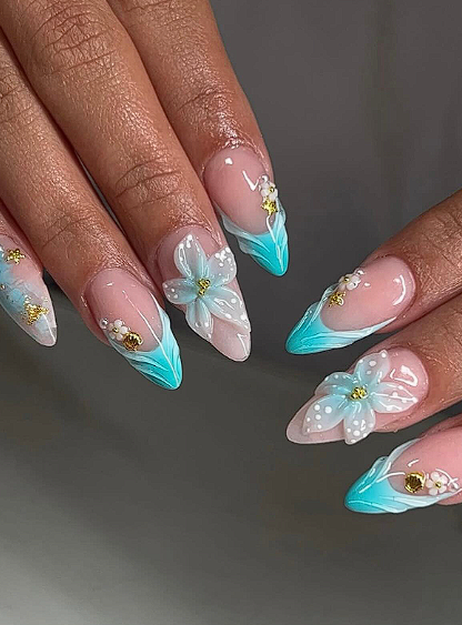 Floral designs soften turquoise and give it a fresh, feminine feel. White or pastel flowers look especially pretty against a turquoise base. You can keep florals minimal or use them as accent nails only. This style works beautifully for spring and summer manicures.