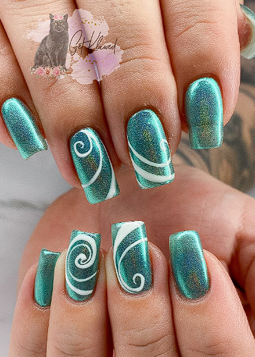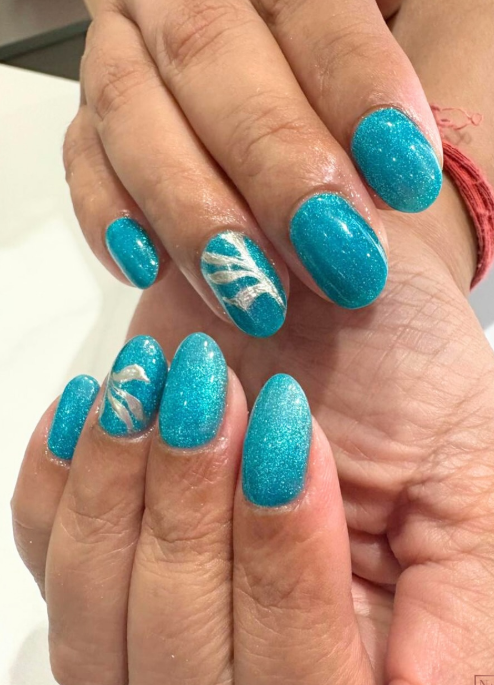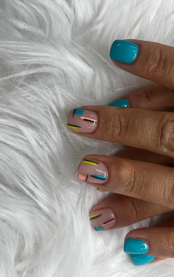 Abstract swirls are one of the easiest trendy options. A nude base with turquoise swirls looks stylish and not too loud. Another popular idea is geometric designs, like thin lines or negative space patterns using turquoise and neutral shades.
