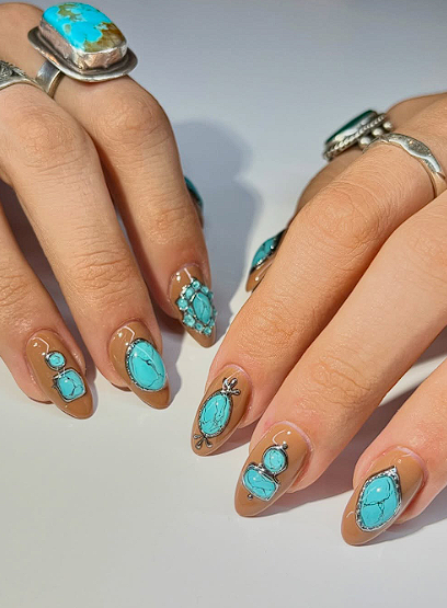 Turquoise looks great on all shapes, but almond and coffin shapes are especially popular because they balance the bold color with a flattering silhouette.