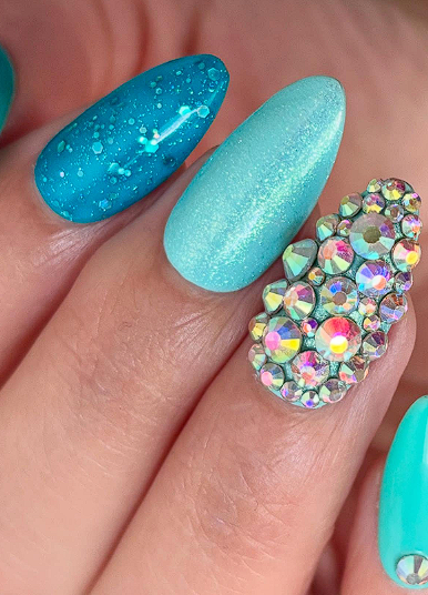 Adding small gems to turquoise nails creates instant glamour. Keep the stones minimal to avoid overpowering the color. A single gem at the cuticle or on an accent nail looks elegant and intentional. This style is perfect for parties, weddings, or special occasions.