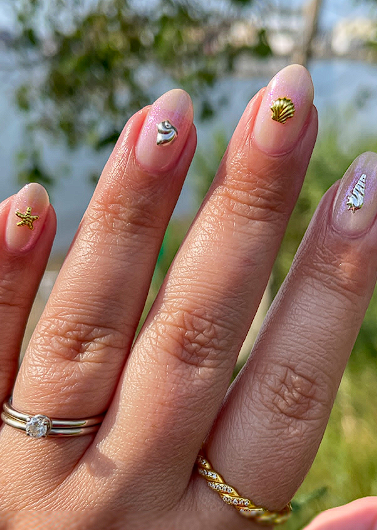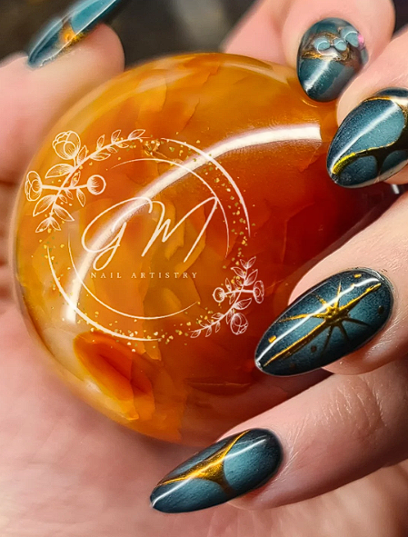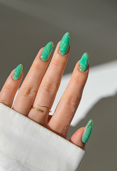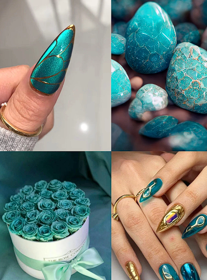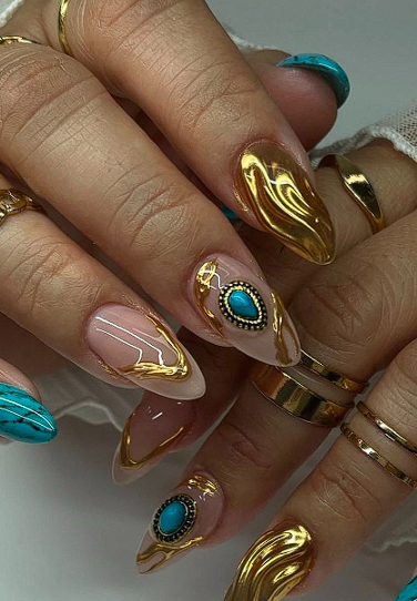 You can also add tiny details like gold foil, small stars, or a single gemstone on an accent nail. Turquoise with gold looks especially luxe, giving a jewelry-like effect.