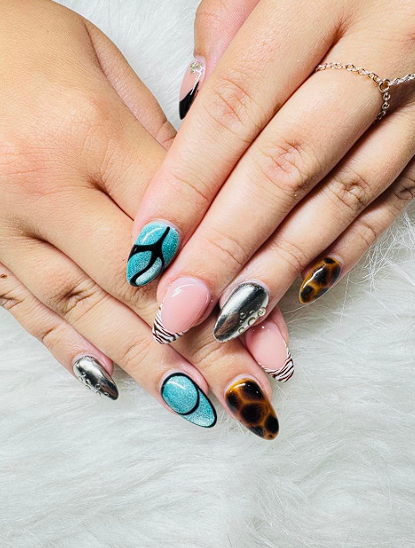 On long nails, you can explore more detailed designs like marble effects, layered ombré, or mixed finishes. Turquoise marble nails with white veining look especially luxe. You can also add chrome accents for extra shine.