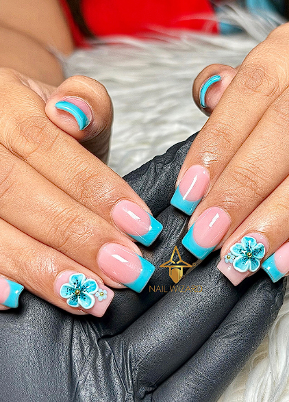 A nude base with turquoise French tips is one of the most wearable options. It looks clean, stylish, and not too bold for everyday life.