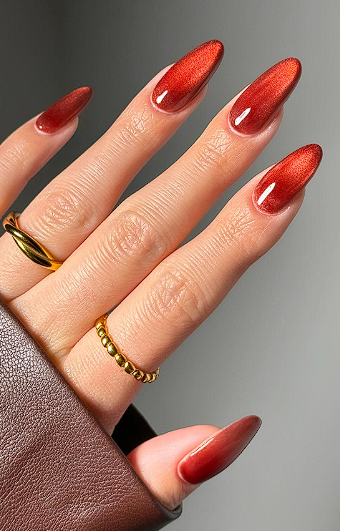 Velvet or “cat eye” gel nails create a soft, dimensional shimmer. The effect shifts in light, making nails look rich and cozy. Deep shades like emerald, burgundy, and chocolate work especially well. Velvet finishes feel festive without needing extra nail art.