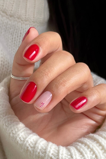 For an ultra simple festive look, choose a classic winter color like burgundy or forest green and add one accent nail with a soft shimmer top coat. It feels special, but still wearable all season.