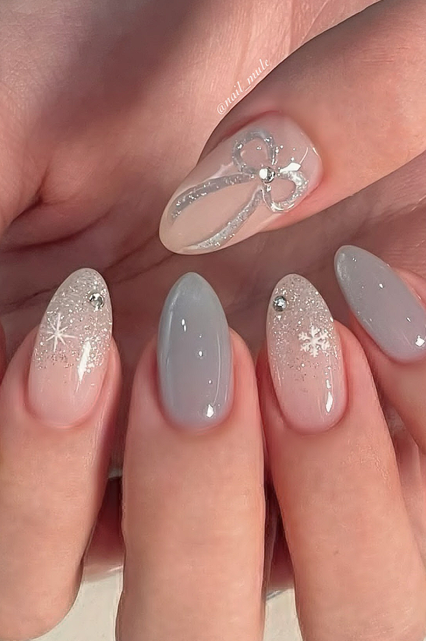 If you want a softer take, choose a pale pink base with a pearly top coat. It gives that icy glow without feeling too cold.