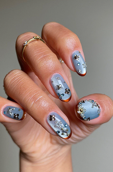 A frosted effect can be created with a fine shimmer top coat over a pale base. Chrome finishes also work well, especially silver chrome on a nude or light grey base. These manicures look especially stunning in winter daylight and in flash photos.